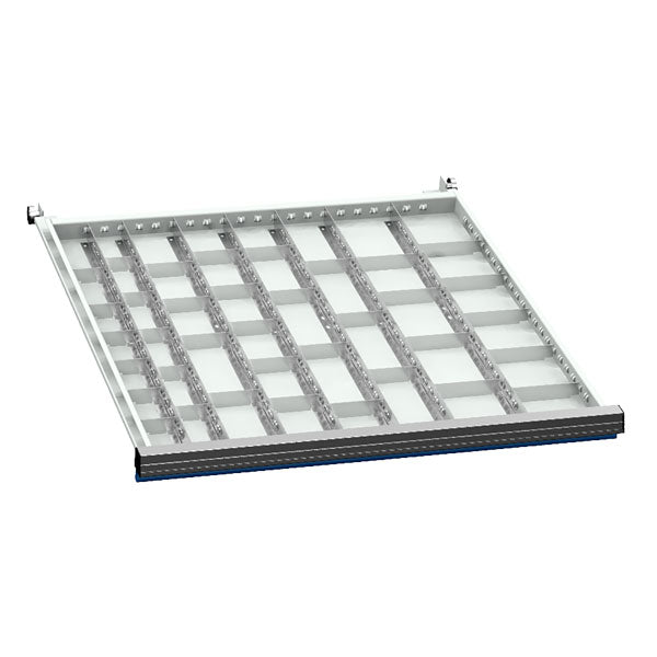 Praktisk skuffeindretning produceret i galvaniseret stål, til brug i vore skuffesektioner i størrelse b x d = 705 x 736 mm / værktøjskuffer med indvendig størrelse 600 x 600 mm. Inddelingen er tilpasset skuffer med højde 150/175 mm, og kan justeres således at du kan indrette dine skuffesektioner tilpasset akkurat dit behov.Specifikationer: