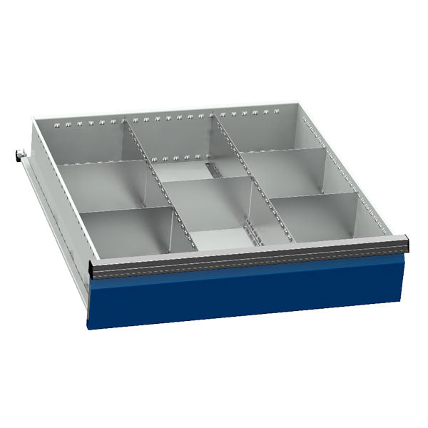 Praktisk skuffeindretning produceret i galvaniseret stål, til brug i vore skuffesektioner i størrelse b x d = 705 x 736 mm / værktøjskuffer med indvendig størrelse 600 x 600 mm. Inddelingen er tilpasset skuffer med højde 100/125 mm, og kan justeres således at du kan indrette dine skuffesektioner tilpasset akkurat dit behov.Specifikationer: