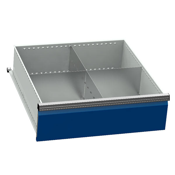Praktisk skuffeindretning produceret i galvaniseret stål, til brug i vore skuffesektioner i størrelse b x d = 705 x 736 mm / værktøjskuffer med indvendig størrelse 600 x 600 mm. Inddelingen er tilpasset skuffer med højde 150/175 mm, og kan justeres således at du kan indrette dine skuffesektioner tilpasset akkurat dit behov.Specifikationer: