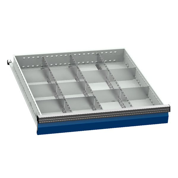 Praktisk skuffeindretning produceret i galvaniseret stål, til brug i vore skuffesektioner i størrelse b x d = 705 x 736 mm / værktøjskuffer med indvendig størrelse 600 x 600 mm. Inddelingen er tilpasset skuffer med højde 50 mm, og kan justeres således at du kan indrette dine skuffesektioner tilpasset akkurat dit behov.Specifikationer: