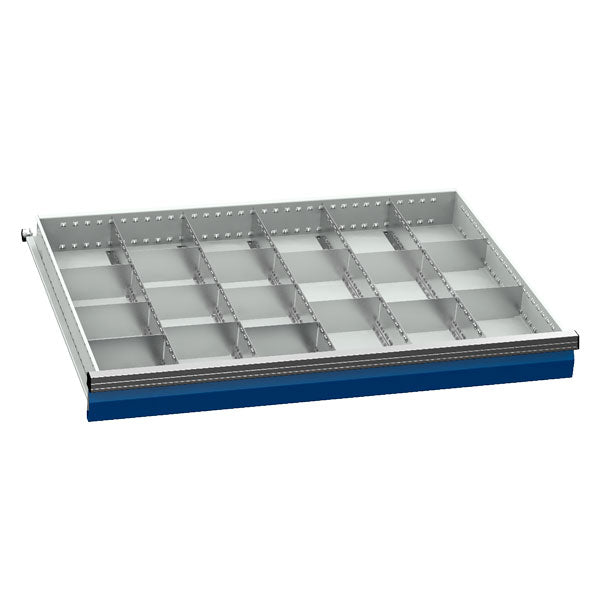 Praktisk skuffeindretning produceret i galvaniseret stål, til brug i vore skuffesektioner i størrelse b x d = 1005 x 736 mm / værktøjskuffer med indvendig størrelse 900 x 600 mm. Inddelingen er tilpasset skuffer med højde 200/300 mm, og kan justeres således at du kan indrette dine skuffesektioner tilpasset akkurat dit behov.Specifikationer: