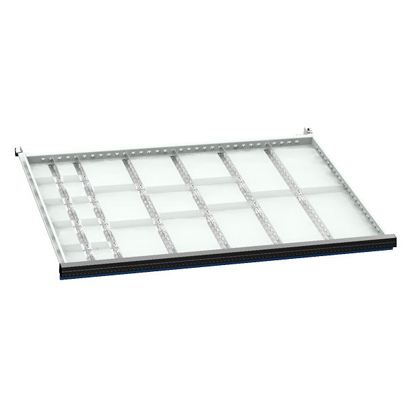 Praktisk skuffeindretning produceret i galvaniseret stål, til brug i vore skuffesektioner i størrelse b x d = 1005 x 736 mm / værktøjskuffer med indvendig størrelse 900 x 600 mm. Inddelingen er tilpasset skuffer med højde 150/175 mm, og kan justeres således at du kan indrette dine skuffesektioner tilpasset akkurat dit behov.Specifikationer: