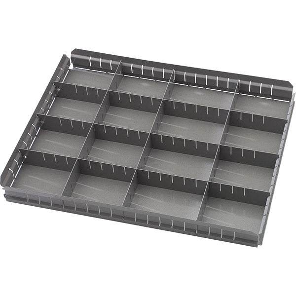 Praktisk skuffeindretning produceret i galvaniseret stål, til brug i vore skuffesektioner i størrelse b x d = 535 x 665 mm / værktøjskuffer med indvendig størrelse 450 x 605 mm. Inddelingen har højde 65 mm og er dermed tilpasset skuffer med højde 100/150 mm. Inddeling kan justeres således at du kan indrette dine skuffesektioner tilpasset akkurat dit behov.Specifikationer: