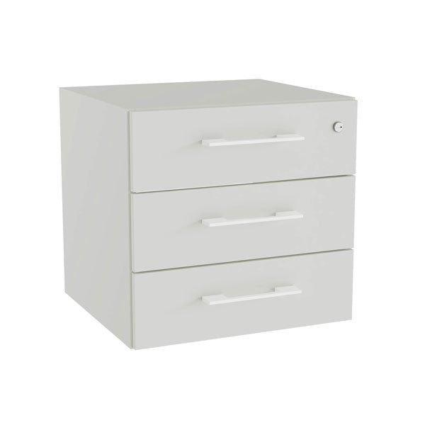 Skuffeindsats i lys grå laminat, med hvide håndtag. Indsatsen har størrelse (bxdxh) 380 x 352 x 352mm og er tilpasset vores DNA bogreoler eller kontorskabe.