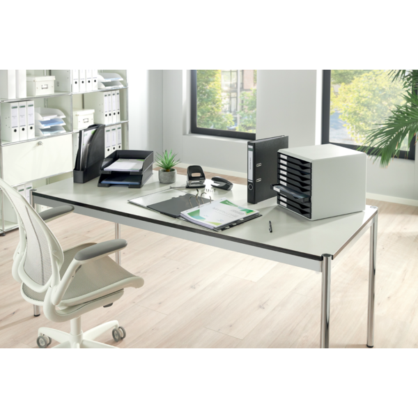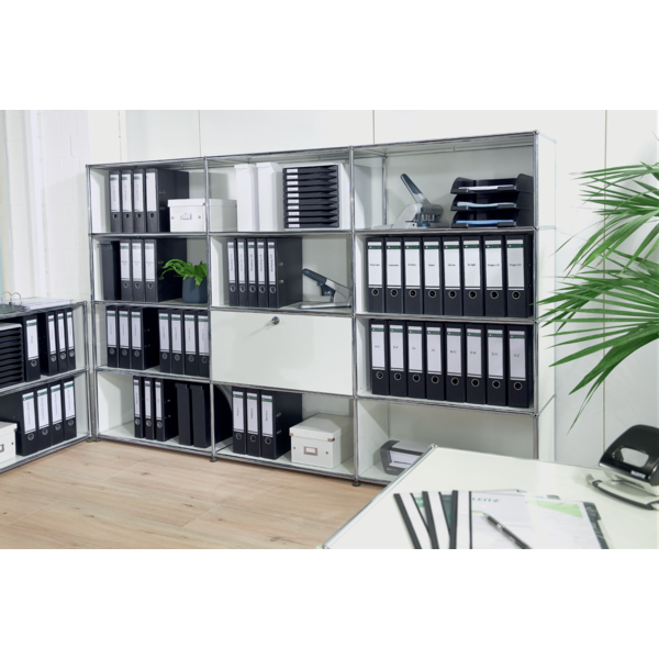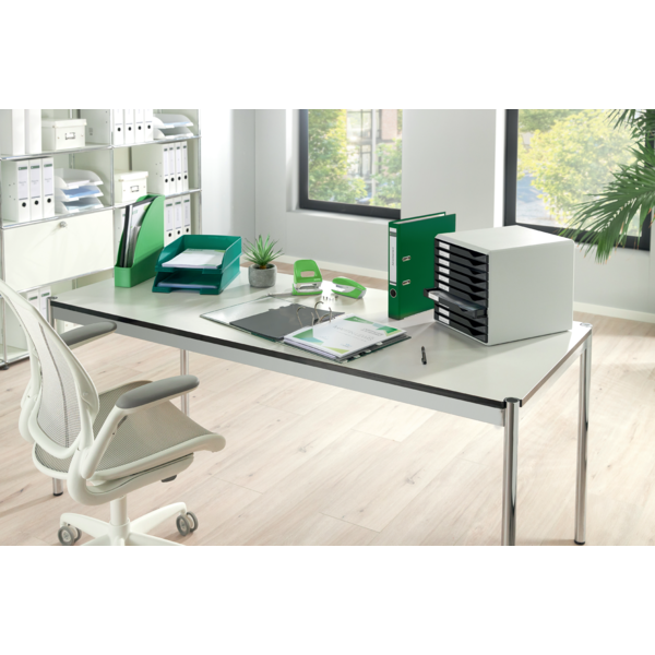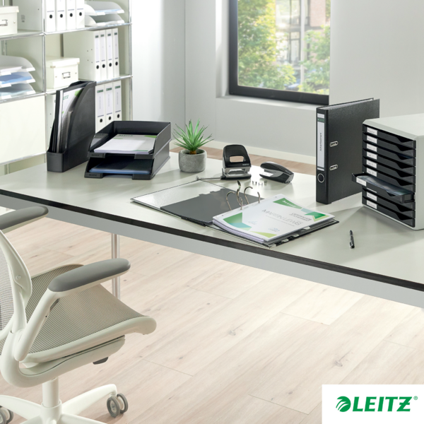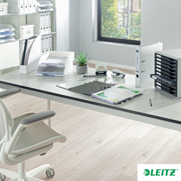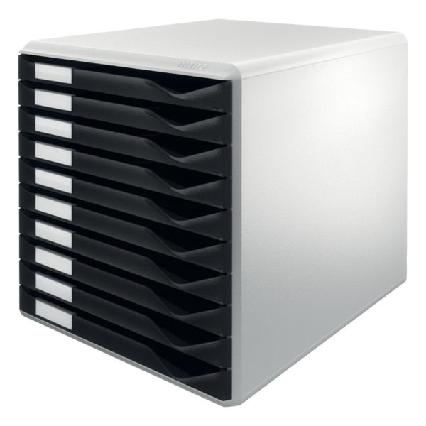 Opbevar dine dokumenter og småting sikkert og stilfuldt med dette elegante og robuste skuffekabinet fra Leitz. Kabinettet har 10 'easy-glide' skuffer med skuffestop og indvendige mål på 24,8 x 32,5 cm, hvilket sikrer optimal opbevaring.