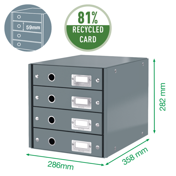 Skuffekabinet med 4 skuffer til opbevaring af A4 dokumenter. Kan foldes sammen til pladsbesparende opbevaring, når den ikke er i brug. Fingerhul i metal til brugervenlig åbning. Etiketholder til indeksering. Fremstillet af stærkt, førsteklasses genbrugspap. Lamineret overflade for en bedre og langvarig beskyttelse. Moderne og nutidigt design, der vil se godt ud både hjemme og på kontoret. Hver skuffe har plads til 500 ark A4-papir (80g).