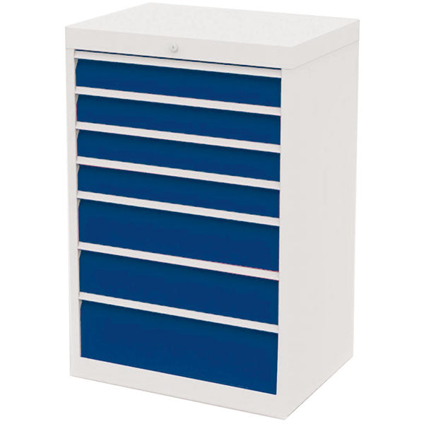Skuffesektion med 100% udtræk. Benyttes for værktøjsopbevaring - fritstående placering, gerne i kombination med trucksokkel for enkel flytning med palleløfter eller gaffeltruck, alternativt på understel m/hjul. Farve: Kabinet RAL 9002, lys grå og skuffefront RAL 5005, blå.Indeholder: 4 stk. skuffer 100 mm, 2 stk. skuffer 150 mm og 1 stk. skuffe 200 mm.