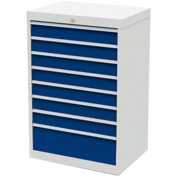 Skuffesektion med 100% udtræk. Benyttes for værktøjsopbevaring - fritstående placering, gerne i kombination med trucksokkel for enkel flytning med palleløfter eller gaffeltruck, alternativt på understel m/hjul. Farve: Kabinet RAL 9002, lys grå og skuffefront RAL 5005, blå.Indeholder: 7 stk. skuffer 100 mm og 1 stk. skuffe 200 mm.