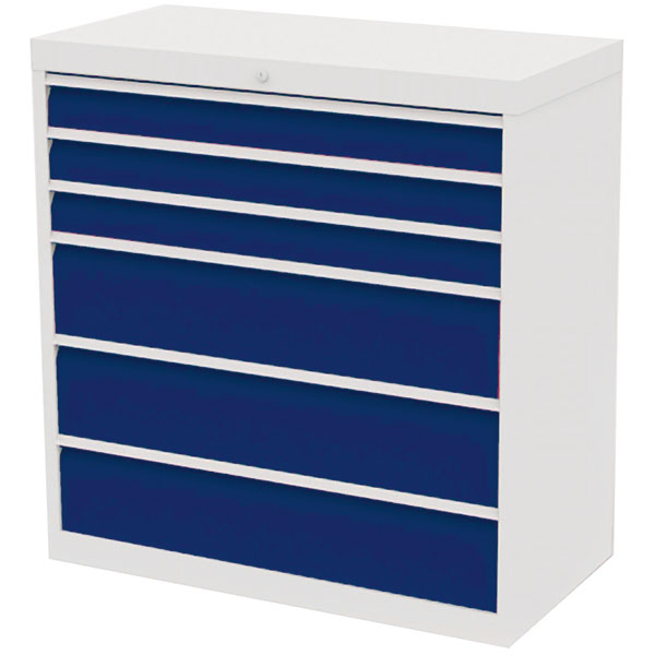 Skuffesektion med 100% udtræk. Benyttes for værktøjsopbevaring - fritstående placering, gerne i kombination med trucksokkel for enkel flytning med palleløfter eller gaffeltruck, alternativt på understel m/hjul. Farve: Kabinet RAL 9002, lys grå og skuffefront RAL 5005, blå.Indeholder: 3 stk. skuffer 100 mm og 3 stk. skuffer 200 mm.