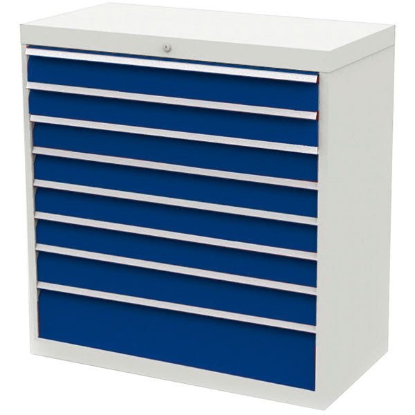Skuffesektion med 100% udtræk. Benyttes for værktøjsopbevaring - fritstående placering, gerne i kombination med trucksokkel for enkel flytning med palleløfter eller gaffeltruck, alternativt på understel m/hjul. Farve: Kabinet RAL 9002, lys grå og skuffefront RAL 5005, blå.Indeholder: 7 stk. skuffer 100 mm og 1 stk. skuffe 200 mm.