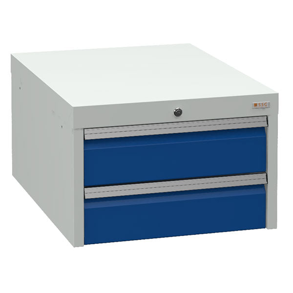 Værksted indretning, individuelt tilpasset til proffesionelt brug!Skuffesektion til montering under bord 500 med 88 % udtræk. Farve: Kabinet RAL 9002, lys grå og skuffefront RAL 5005, blå.