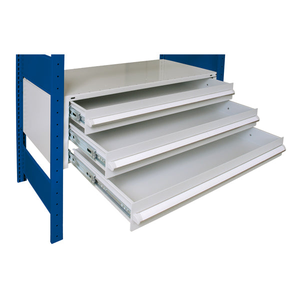 Solid skuffesektion med 3 skuffer, beregnet for placering i reoler med bredde 1000 mm og dybde 600 mm. Samlet højde på skuffesektionen er 300 mm.