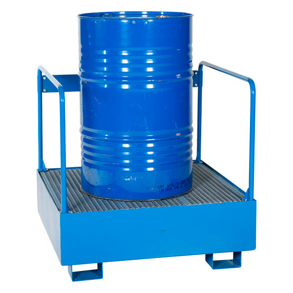 Spildbakke inkluderet rækværk og med opsamlingsvolumen 220l, beregnet til opbevaring af en tønde stående. Spildbakken har galvaniseret rist og håndteres let med palleløfter, stabler eller gaffeltruck. For yderligere at forenkle håndteringen af ??spildbakken, kan et sæt hjul bestilles som tillæg.