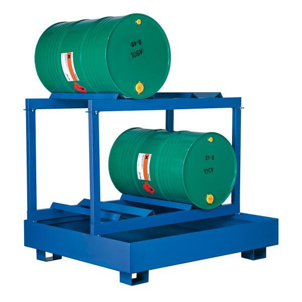 Spildbakke med opsamlingsvolumen 440l, beregnet til opbevaring af fire tønder liggende. Miljøpallen har et praktisk stativ til stabil opbevaring af fire tønder og håndteres nemt med palleløfter, stabler eller gaffeltruck.
