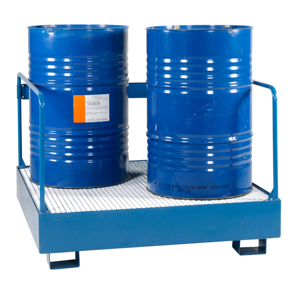 Spildbakke inkluderet rækværk og med opsamlingsvolumen 380l, beregnet til opbevaring af fire tønder stående. Spildbakken har galvaniseret rist og håndteres let med palleløfter, stabler eller gaffeltruck.