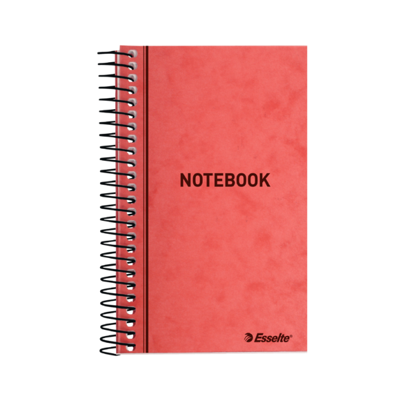Spiralnotes med omslag i rød glanskarton og sort spiral i venstre side. Hvidt, glittet skrivepapir med 50 linierede blade. 6,0 mm linieaftstand i gråt tryk. Svanemærket tryksag, 4041 0675.