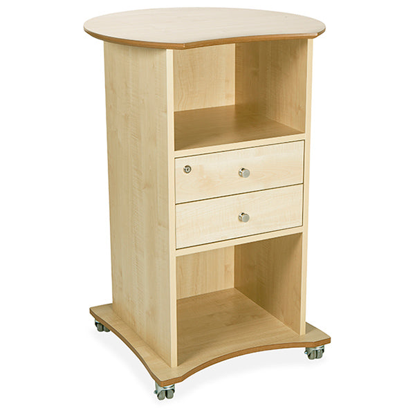Mobilt ståbord i birk laminat udførelse, på hjul og med stor bundplade for bedret stabilitet. Bordet har h x b x d = 1075 x 450 x 460 mm, og leveres med 2 skuffer, hvoraf 1 er låsbar. Gode rum for opbevaring av A4 ringbind. Produktet har fire låsbare hjul