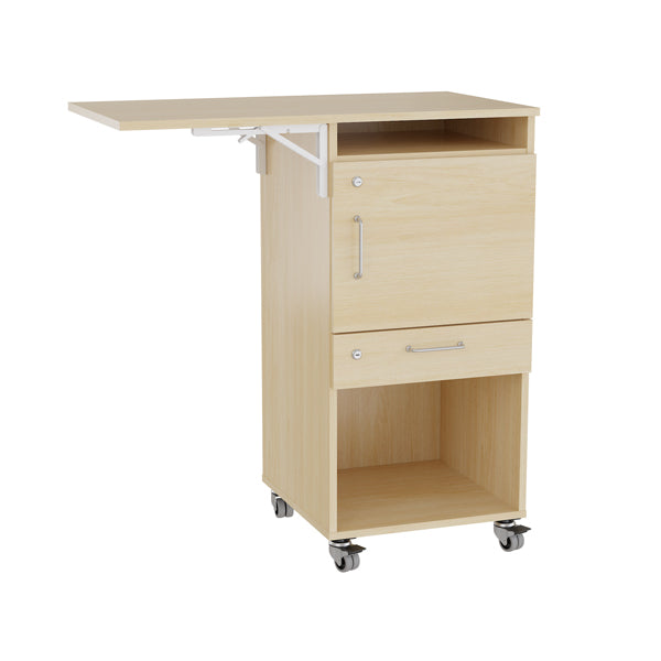 Ståbord Stig laminat med 4 låsbare hjul, låsbar dør og skuffe, venstre klap.