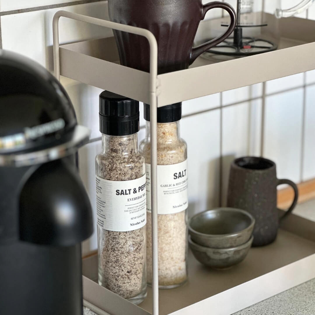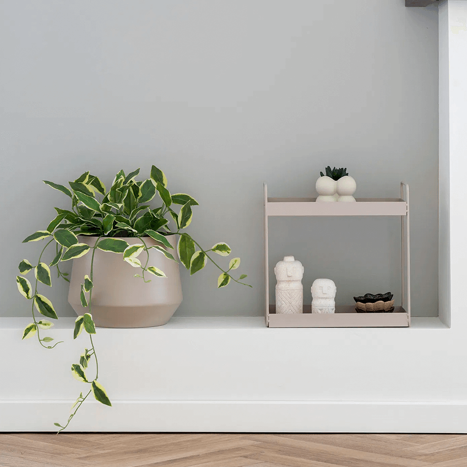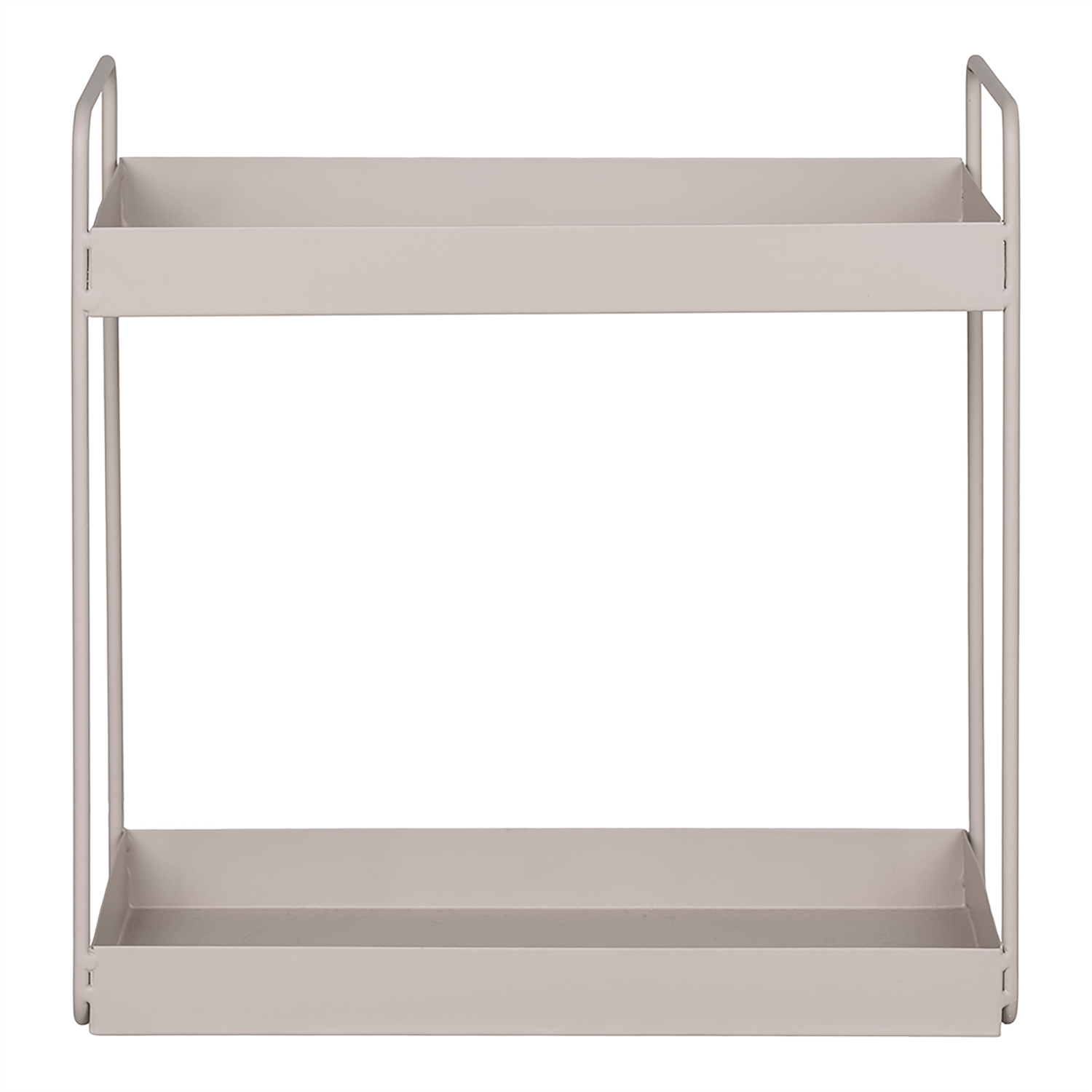 Stående hylde / bakke, i beige metal, med 2 opbevaringshylder. Måler 30 x 31 x 15 cm. Farven er en blanding af beige og lysegrå, som passer til det meste. Praktisk bakke til køkkenbordet til opbevaring af f.eks. olie, krydderier og krydderurter. Også praktisk til badeværelset til cremer, parfumer m.v. eller blot til dekoration, f.eks. i vinduet med små planter og lys.Dette er det perfekte supplement til ethvert hjem, der ønsker et strejf af stil og organisation. Den smukke blanding af beige og lysegrå farve gør den både moderne og tidsløs. Med sin kompakte størrelse og alsidighed, vil denne stående hylde utvivlsomt give dit rum et pænt og organiseret udtryk. Der er på lager nu og klar til levering direkte til dit hjem!