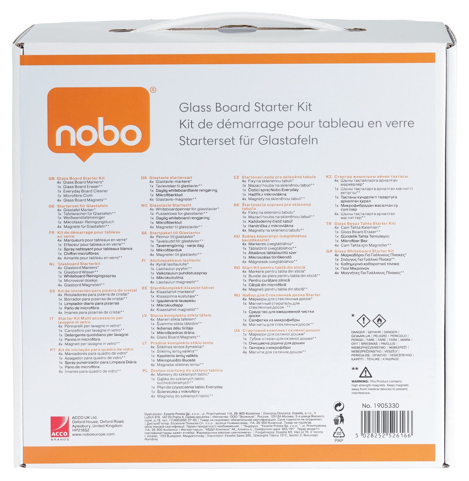 Kittet inkluderer 4 glas tavlemarkører, glas tavlevisker, Nobo renseskum, mikrofiberklud og 4 ekstra stærke glastavle magneter.