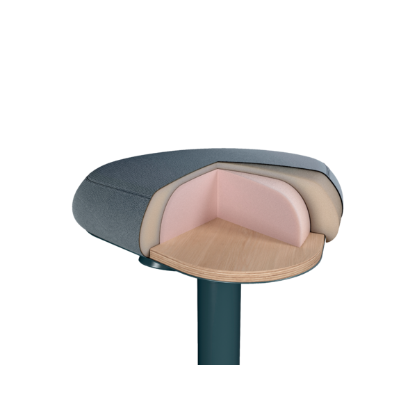 - Trekantet, unikt komfortsæde i Dual Density Foam (DDF) med fast, ergonomisk støttekerne, der fordeler vægten jævnt over bækkenet, omgivet af blød skumpolstring, der reducerer trykket på lår og ben som på en sadelstol