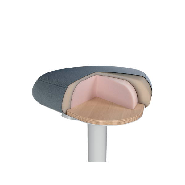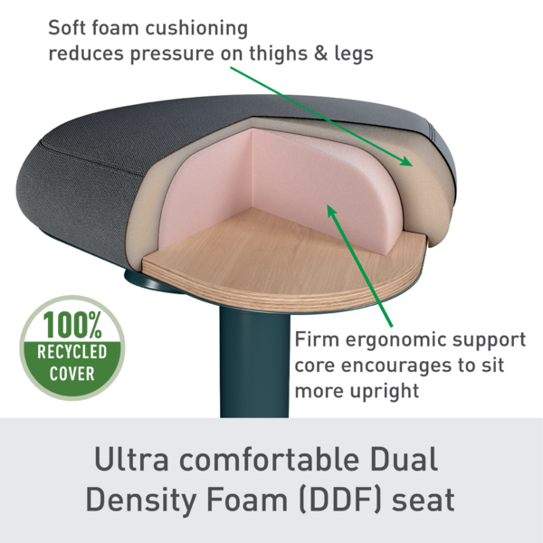 - Trekantet, unikt komfortsæde i Dual Density Foam (DDF) med fast, ergonomisk støttekerne, der fordeler vægten jævnt over bækkenet, omgivet af blød skumpolstring, der reducerer trykket på lår og ben som på en sadelstol