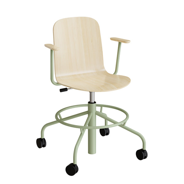 Stol ADD med armlæn og formpresset skal belagt med højtrykslaminat. Justerbar højde med gascylinder og lakeret 4-fodskryds med hjul og fodring. Anbefales til klasseværelser og møbelserien inkluderere også borde.