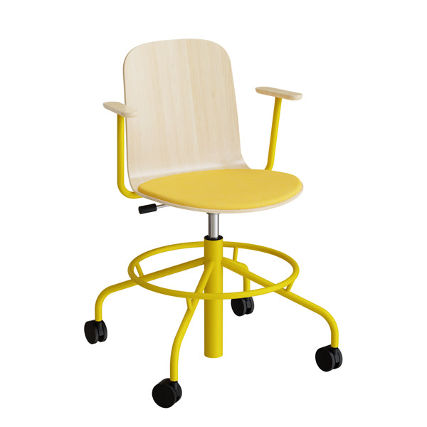 Stol ADD 5903, Fodkryds, hjul og armlæn, Hvidpigmenteret eg laminat, Sæde med gult tekstil, Gult stel