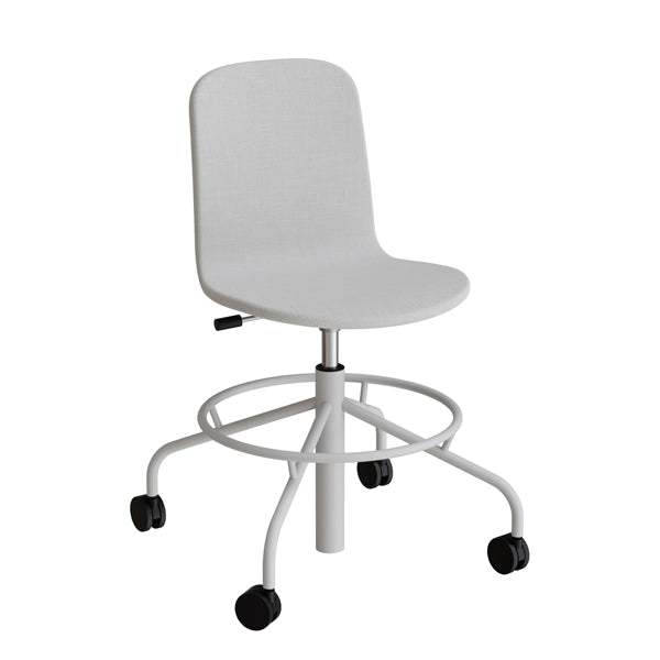 Stol ADD med formpresset skal, helbetrukket med tekstil. Justerbar højde med gascylinder og lakeret 4-fodskryds med hjul og fodring. Anbefales til klasseværelser og møbelserien inkluderere også borde.