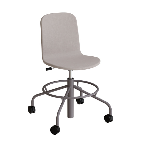 Stol ADD med formpresset skal, helbetrukket med tekstil. Justerbar højde med gascylinder og lakeret 4-fodskryds med hjul og fodring. Anbefales til klasseværelser og møbelserien inkluderere også borde.