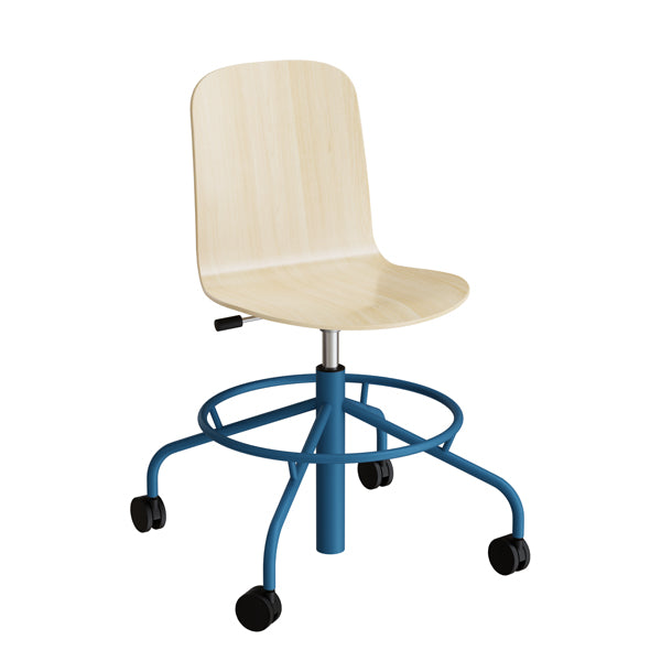 Stol ADD med formpresset skal belagt med højtrykslaminat. Justerbar højde med gascylinder og lakeret 4-fodskryds med hjul og fodring. Anbefales til klasseværelser og møbelserien inkluderere også borde.