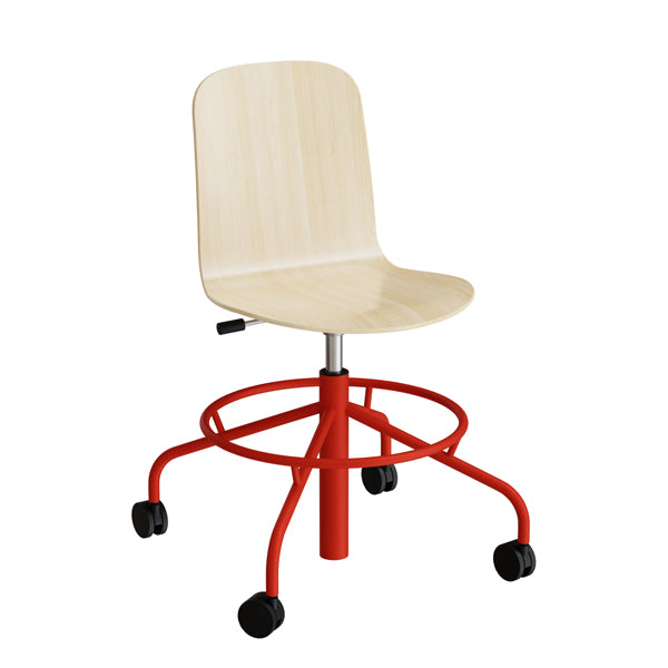 Stol ADD 5903, Fodkryds og hjul, Hvidpigmenteret eg laminat, Rødt stel