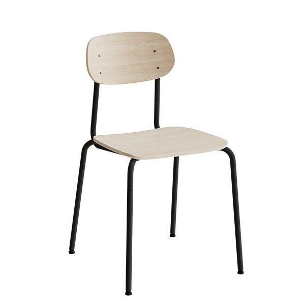 Sæde og ryg er formstøbt og beklædt med højtrykslaminat i hvidpigmenteret eg.