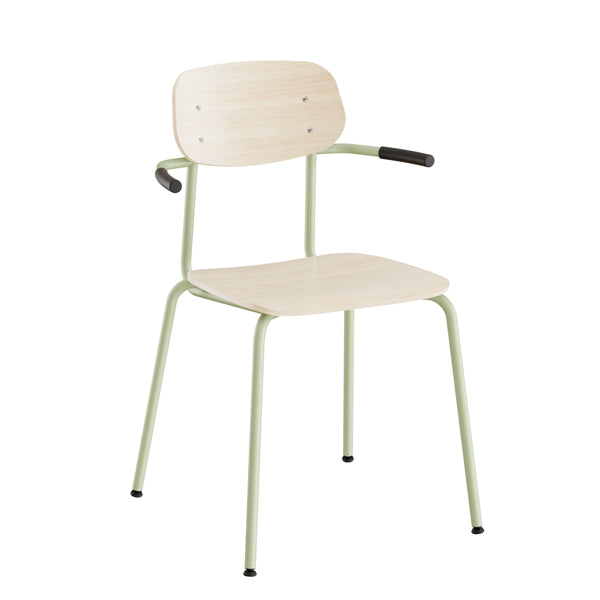 Atlas stol med formstøbt sæde og ryg beklædt med højtrykslaminat i hvidpigmenteret eg og stel af pulverlakeret stål. Stolen er stabelbar og har rygstøtte, en fin detalje som også fungerer som en integreret taskekrog. Leveres med leddelt gulvbeskyttelse med nylonoverflade som standard. Gulvbeskyttelse med filtoverflade fås som et alternativ til et mere stille miljø. Atlas 2111 passer godt som elevstol til højtrinnet og gymnasiet eller som kantinestol.
