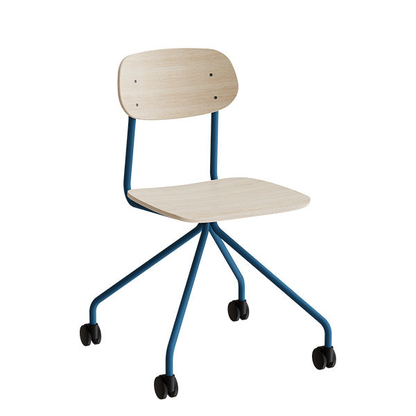 Stol Atlas 2112 på hjul, hvidpigmenteret egelaminat, blåt stel