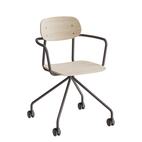 Atlas stol med formstøbt sæde og ryg beklædt med højtrykslaminat i hvidpigmenteret eg og stel af pulverlakeret stål. Fast 4-bens kryds på hjul, med en rygafstand der bliver en fin detalje men fungerer også som en integreret taskekrog. Atlas 2112 er velegnet som stol til højtrinnet og gymnasiet eller som kantinestol og konferencestol til det moderne kontor.