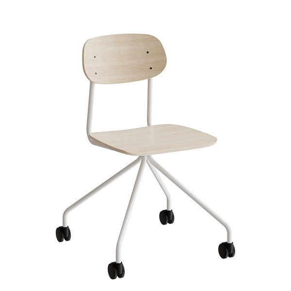 Atlas stol med formstøbt sæde og ryg beklædt med højtrykslaminat i hvidpigmenteret eg og stel af pulverlakeret stål. Fast 4-bens kryds på hjul, med en rygafstand der bliver en fin detalje men fungerer også som en integreret taskekrog. Atlas 2112 er velegnet som stol til højtrinnet og gymnasiet eller som kantinestol og konferencestol til det moderne kontor.