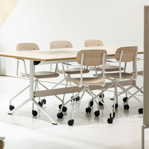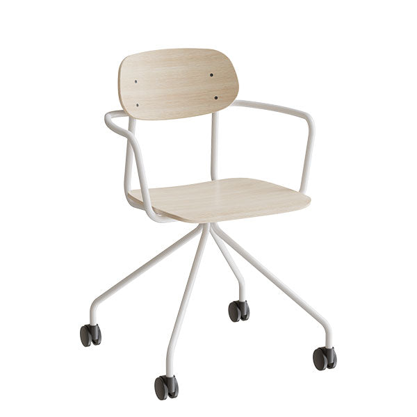 Atlas stol med formstøbt sæde og ryg beklædt med højtrykslaminat i hvidpigmenteret eg og stel af pulverlakeret stål. Fast 4-bens kryds på hjul, med en rygafstand der bliver en fin detalje men fungerer også som en integreret taskekrog. Atlas 2112 er velegnet som stol til højtrinnet og gymnasiet eller som kantinestol og konferencestol til det moderne kontor.