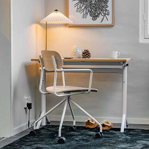 Stol Atlas 2112 på hjul, hvidpigmenteret egelaminat, hvidt stel
