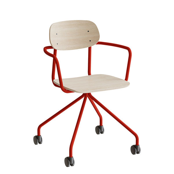 Stol Atlas 2112 på hjul, hvidpigmenteret egelaminat, rødt stel