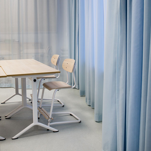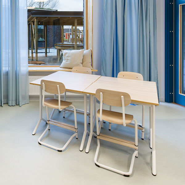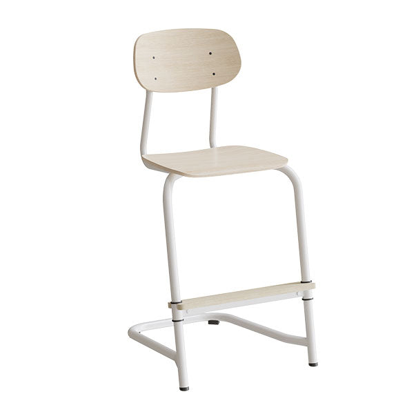Atlas 2114, fritsving børnemodel med formpresset sæde og ryg belagt med højtrykslaminat i hvidpigmenteret eg og pulverlakeret stålstel med mat farve. Med trinløs justerbar fodplade, der giver maksimal fleksibilitet og en rygafstand, der bliver en fin detalje men også fungerer som en integreret taskekrog. Leveres med filtgulvbeskyttelse som standard for et stille lydmiljø. Atlas 2114 er udviklet som elevstol til folkeskolen og mellemtrinnet. Stolen er møbelfakta certificeret.