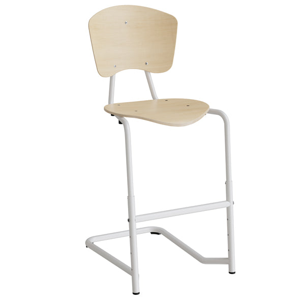 Elevstol Femman med formpresset sæde og ryg med birk finér. Stolen har højdejusterbart stel, pulverlakeret hvidt RAL9003, leveres med fodstøtte og gulvbeskyttelse i filt for et lydsvagt miljø. Femman kan hænges på bordet og passer godt som elevstol til folkeskole eller gymnasium.Specifikationer: