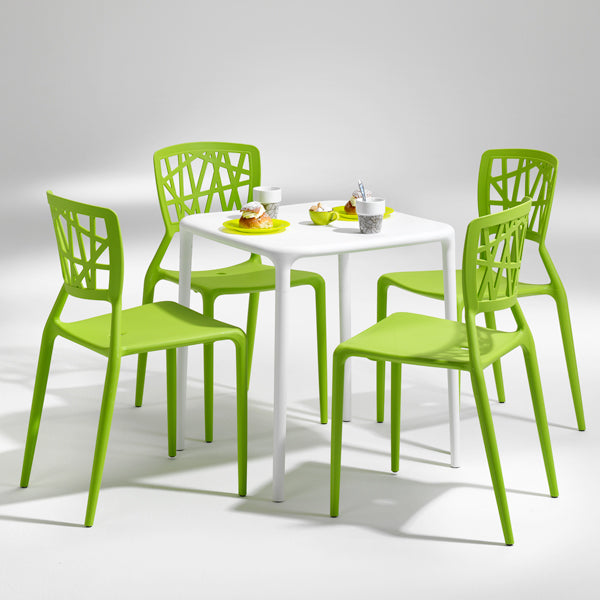 Plaststol Inca i limegrøn. Denne moderne stabelbare plaststol tåler fugt, rengøres let og er tilpasset til både udendørs og indendørs brug. Inca-stolen vejer kun 4,1 kg, men har en stålkerne som gør at den føles meget stabil, samtidig med at den har lang levetid. Vælg stolen Inca for friske farver og lidt liv til spisestuen, kantinen, møderummet eller bare der hvor folk færdes.