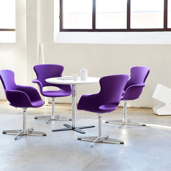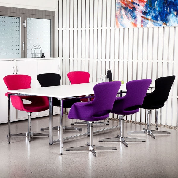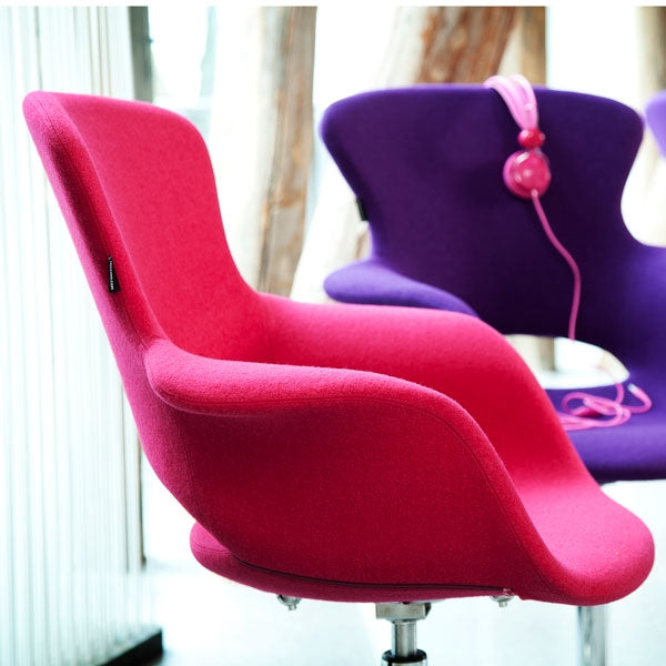 Velkommen til Monaco! Med sine iøjnefaldende farver vil Monaco være et populært og farverigt indslag i ethvert rum. Stolesædet er med helstøbt PU-kerne, helbetrukket med slidstærkt tekstil bestående af 30% uld og 70% polyester, og leveres på et forkromet, drejeligt understel med benkryds.