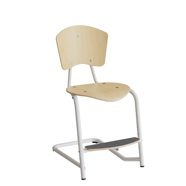 Velegnet til skoler, møderum og kantiner, hvor der er behov for en robust, rengøringsvenlig stol. Fodstøtten giver stabil støtte ved siddehøjde 500 mm og øger komforten. Birkefinér og hvidt stel passer diskret ind i mange miljøer.