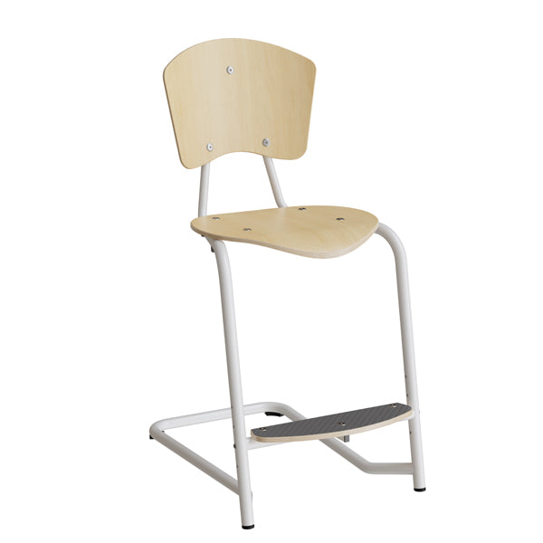 - Sædehøjden på 570 mm gør den velegnet til højborde i undervisnings-, kontor- og kantinemiljøer. - Den integrerede fotplate fungerer som fodstøtte for bedre ergonomi, og birkefinér samt hvidt stel er robuste og lette at rengøre.