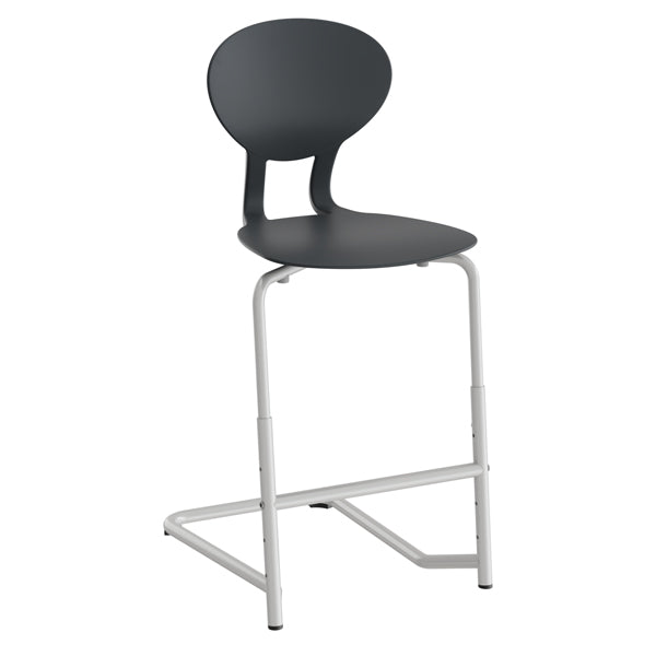 Stol Rocka 3074M med justerbar siddehøjde 440-630 mm (højdeintervaller 450, 510, 570 og 630 mm), justerbar fodpind, siddeskal i sort polyutetan og pulverlakeret alugrå RAL9006 stålstel.Stolens sæde og ryg er formet i et stykke, hvilket giver en naturlig og dejlig støtte i ryggen. Stolen er ophængsbar.