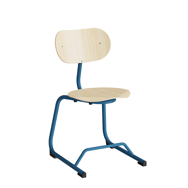 Birkelaminatet er slidstærkt og nemt at rengøre, så stolen egner sig til daglig brug i skoler, kantiner og mødelokaler. De blå ben giver et tydeligt farveindslag, der kan bruges til zonering eller farvekodning af rum.