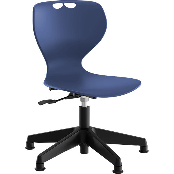Stolen har et blåt gennemfarvet sæde og et sort nylon 5-fods hjulkryds med glidesko.