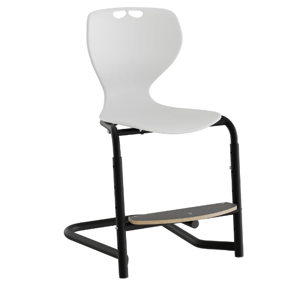 Skolestol Tarris med hvid sæde og understel i pulverlakeret sort RAL9005. Den har fodplade og justerbar siddehøjde 450-630 mm.